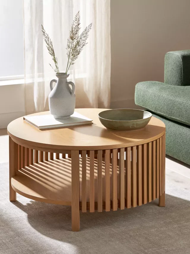 A smooth, round wooden coffee table with vertical slatted sides that cast soft shadows, giving it a calm, airy feel. It adds warmth to a room without trying too hard—simple, modern, and quietly elegant.